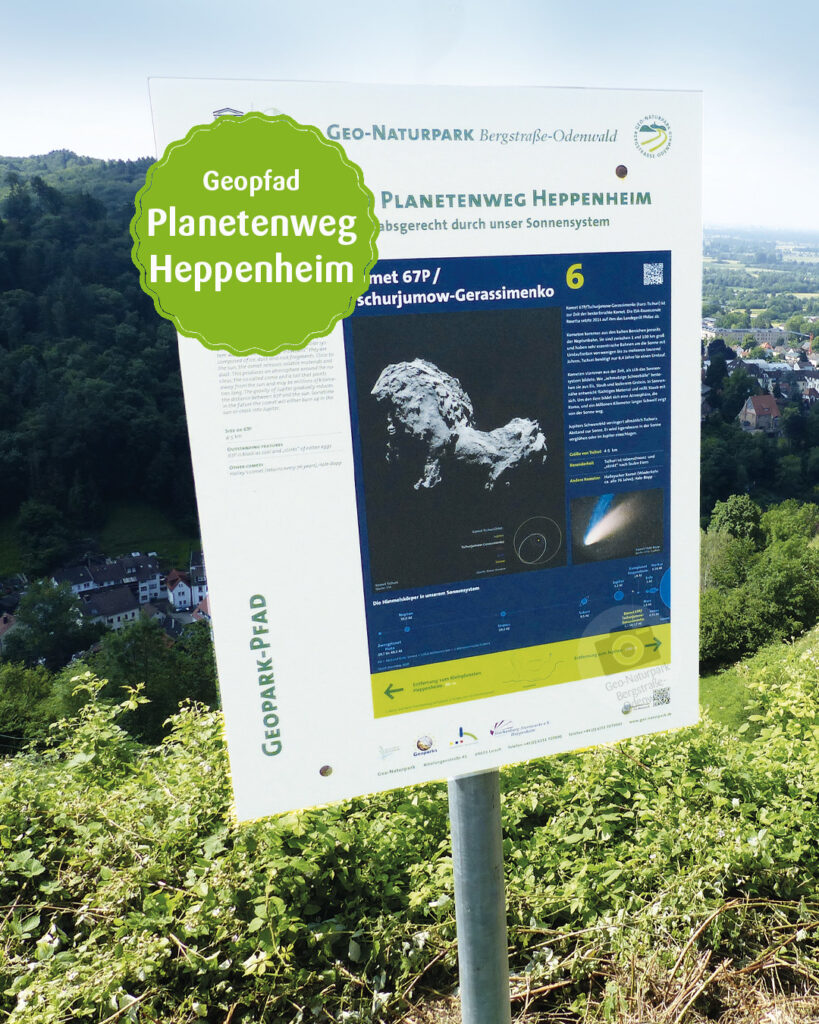 Der Planetenweg führt von der Tourist Info Heppenheim (Fußgängerzone) maßstabsgerecht durch unser Sonnensystem bis zur Starkenburg Sternwarte. Auf einer Länge von ca. zwei Kilometern gibt es neben traumhaften Ausblicken auf die Bergstraßen an 13 Schildern Infos zu Planeten, Kleinplaneten, Kometen und natürlich zur Milchstraße.